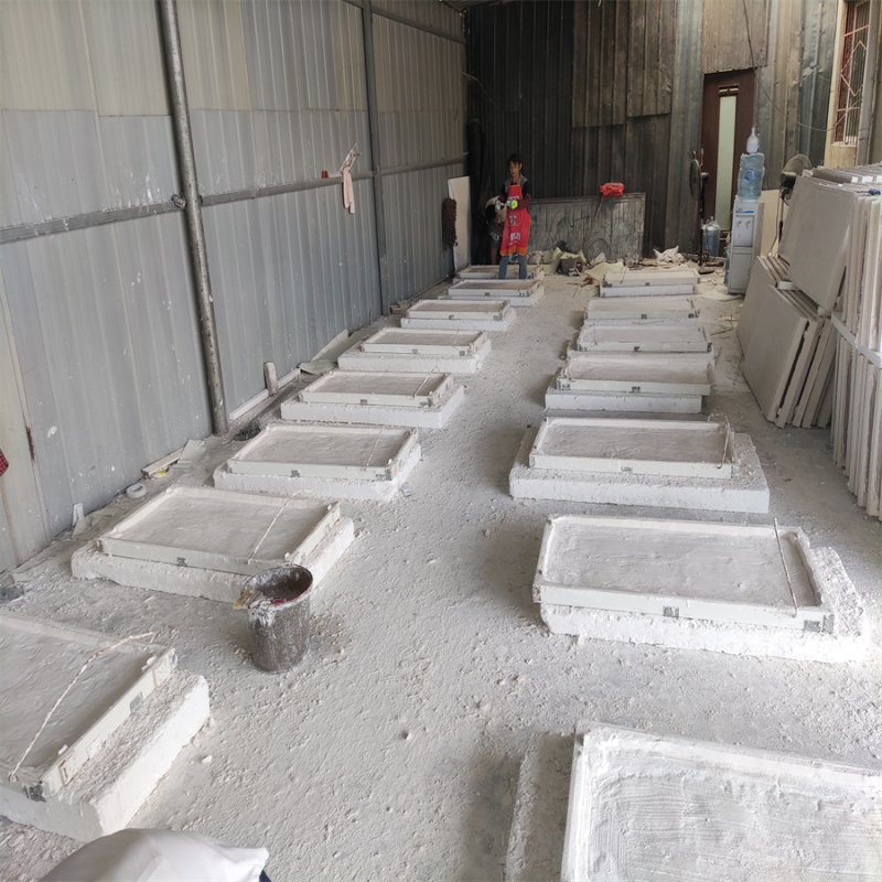 生產(chǎn)技術(shù)部依據(jù)設(shè)計部門制作的片式產(chǎn)品的圖樣和生產(chǎn)制造調(diào)料單,在模具上澆筑獨特熟石膏水溶液并鋪雙層玻纖,待熟石膏水溶液制冷凝結(jié),并置放1小時產(chǎn)品,熱應(yīng)力清除后出模。出模后板片因為環(huán)境濕度比較大放置方式有誤對造成 產(chǎn)品有形變,因此 剛出模的產(chǎn)品要立起來置放并放到地形整平的地區(qū)。
